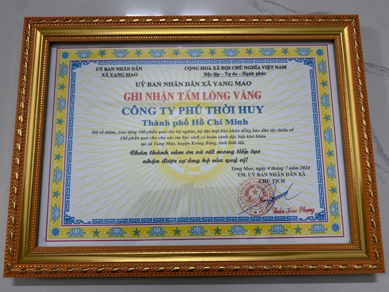 Công ty Phú Thời Huy nhận bằng cảm ơn của UBND xã Yang Mao.