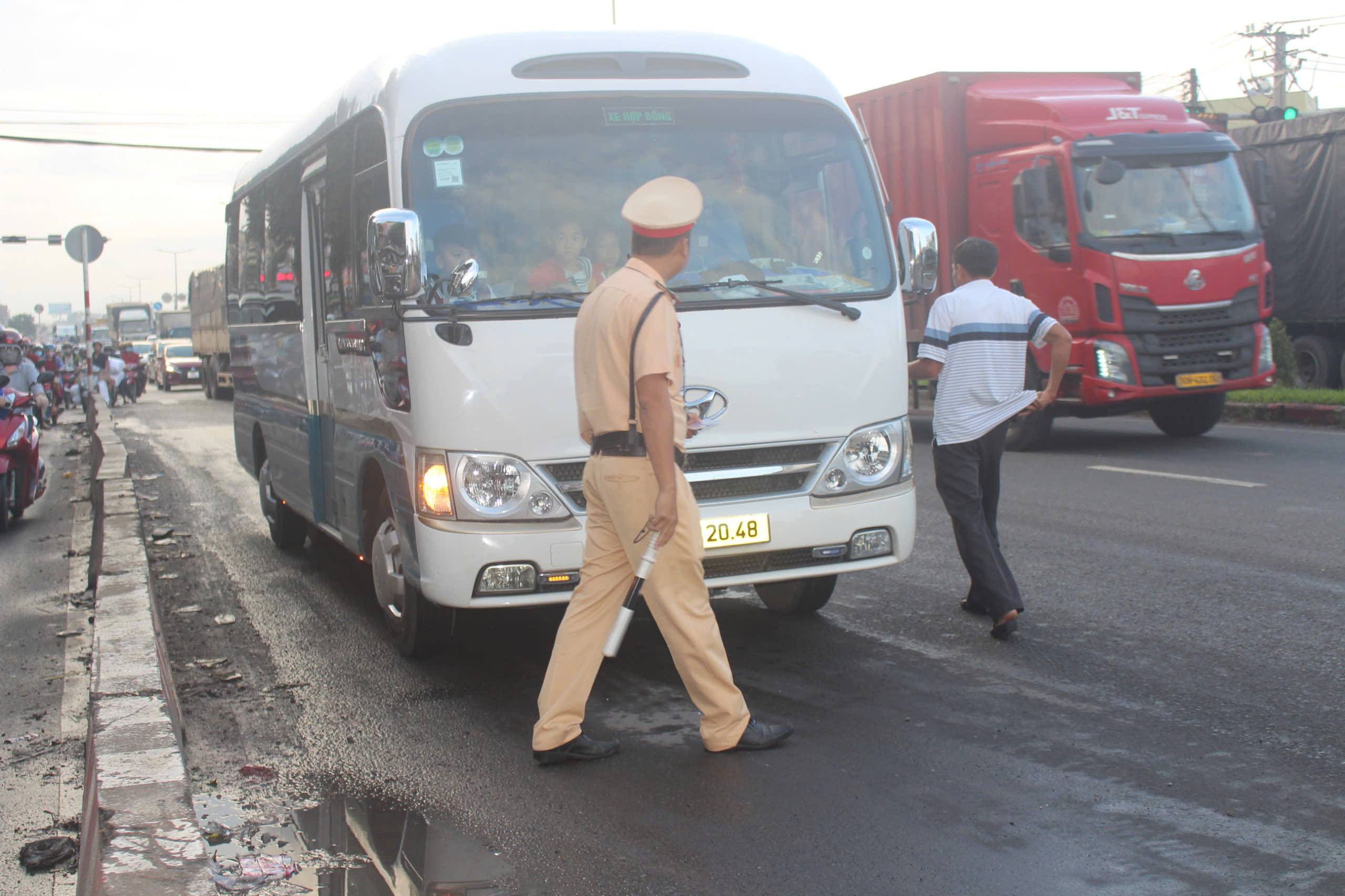 Cũng chiếc xe mang biển số nêu trên, vào lúc 17h30 phút cùng ngày tại trường Trung học cơ sở Long Bình Tân xe này cũng chở quá số người quy định, khi xe ra tới ngã tư đèn đỏ Nguyễn Văn Tỏ và QL51, thì tài xế phát hiện có lực lượng CSGT đang làm nhiệm vụ tuần tra kiểm soát trên đường QL51, thì tài xế cho xe ngừng lại ngay ngã tư đèn đỏ và cho một số em học sinh xuống xe để đi bộ qua bên kia đường nhằm để đối phó với lực lượng CSGT.