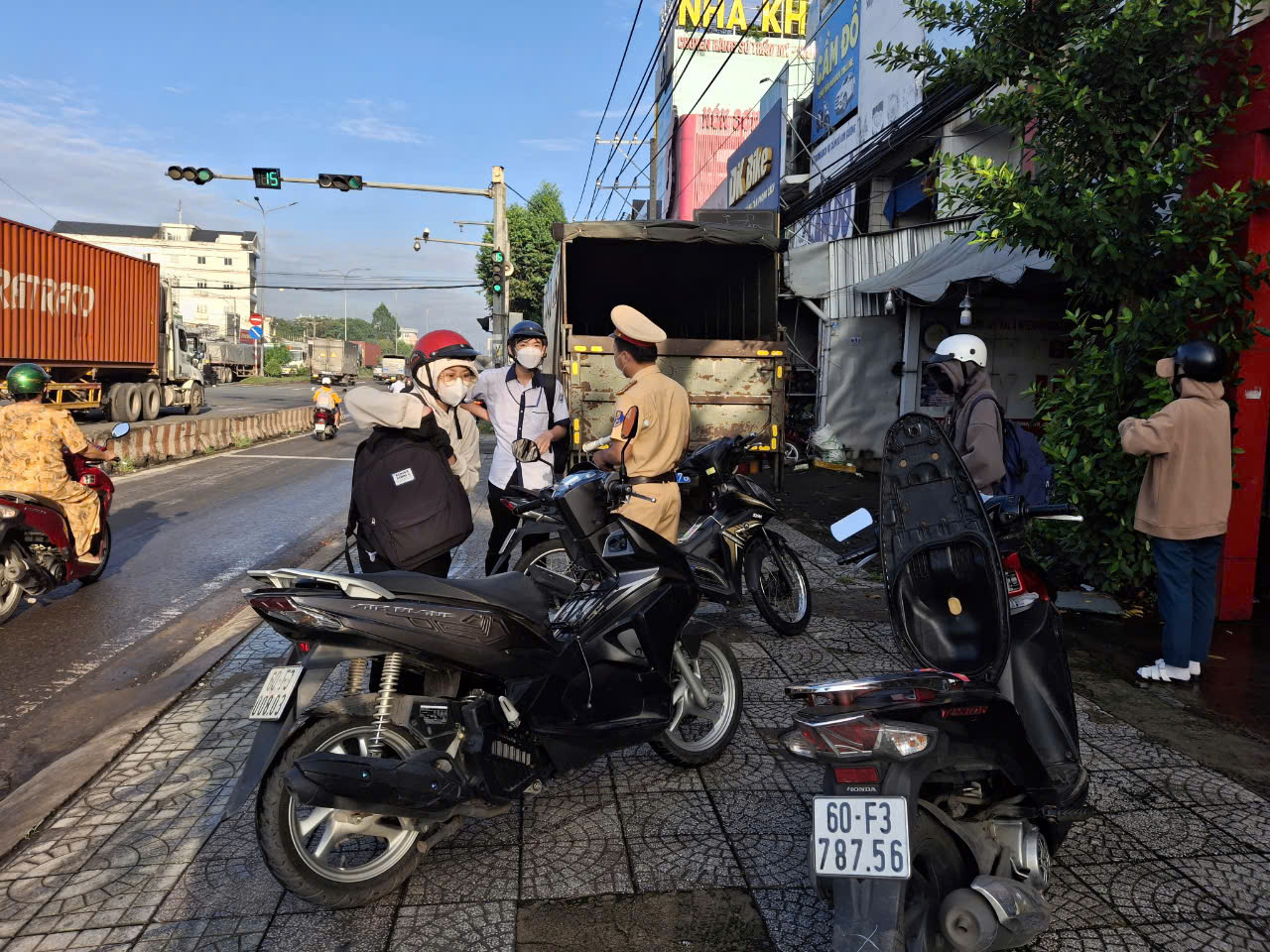 CSGT dừng xe kiểm tra học sinh khi tham gia giao thông trên QL51 bằng xe máy.