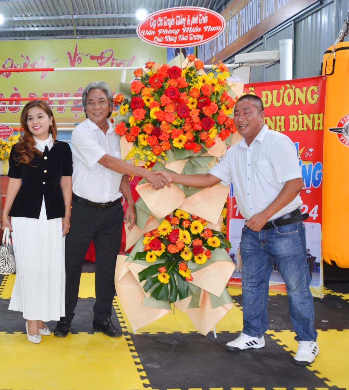 Nhà báo Nguyễn Quang Hiệp, phó Tổng biên tập áo trắng ( bên tay trái) tặng hoa chúc mừng khai trương Võ Đường.