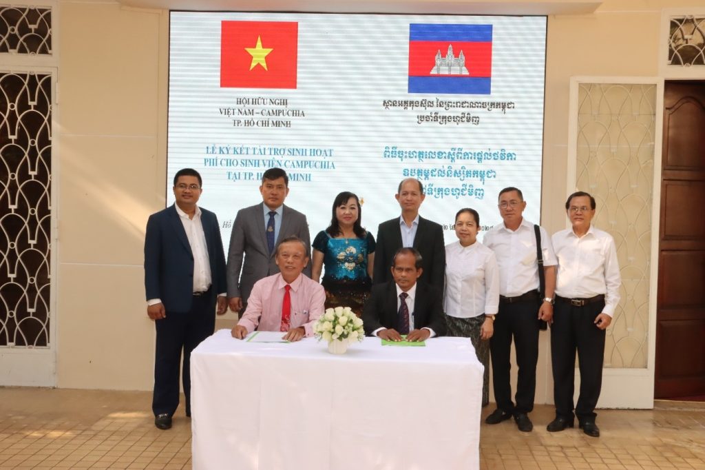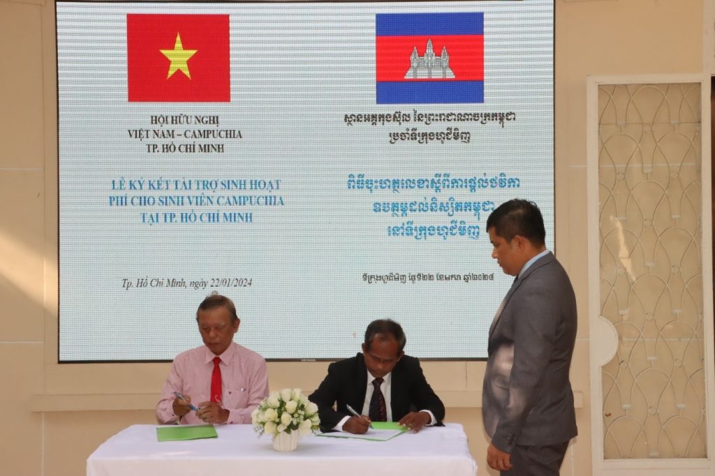 Ngày 22/01/2024 tại Tổng lãnh sự Vương Quốc Campuchia tại thành phố Hồ Chí Minh, Hội Hữu nghị Việt Nam – Campuchia thành phố Hồ Chí Minh do ông Nguyễn Văn Triệu Phó Chủ tịch Thường trực Hội Hữu nghị Việt Nam – Campuchia thành phố Hồ Chí Minh làm Trưởng đoàn, bà Trương Thúy Uyên Phó Chủ tịch, ông Huỳnh Quang Dũng Ủy viên Ban chấp hành – Phó tổng thư ký Hội đã đến Tổng Lãnh sự Vương quốc Campuchia tại thành phố Hồ Chí Minh chúc tết và ký kết bản hợp đồng tài trợ 216 triệu đồng cho 12 sinh viên Campuchia mới sang Việt Nam học tập tại các trường Đại học ở thành phố Hồ Chí Minh năm 2024.