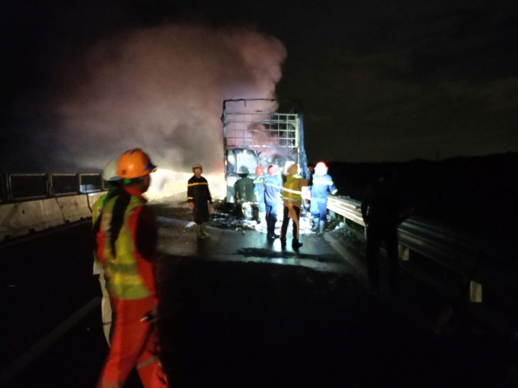 Tại hiện trường, do chở hàng hóa dễ bốc cháy, khiến đám cháy bùng phát nhiều lần, lực lượng cảnh sát cứu hỏa vẫn đang nhanh chóng hỗ trợ, khắc phục đám cháy.