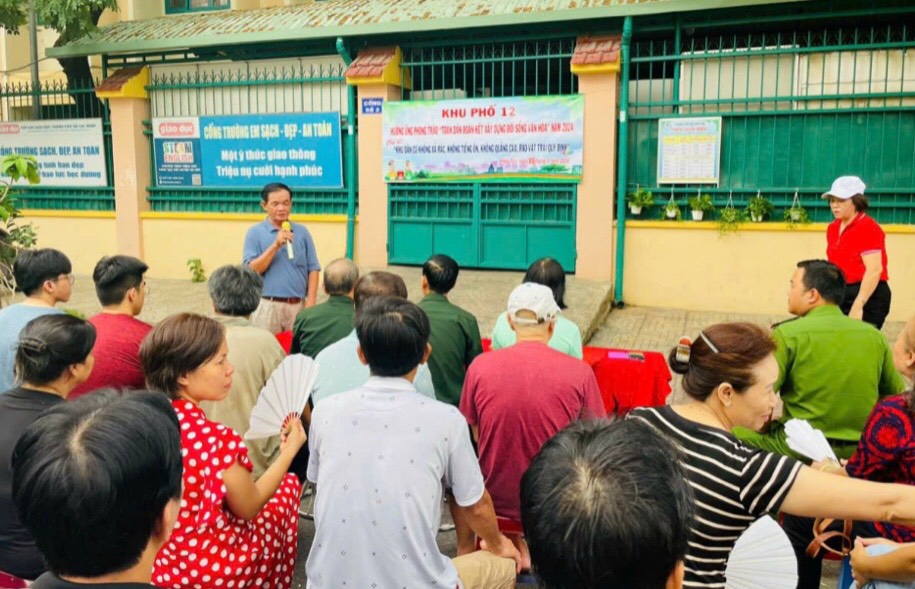 Tiếp đó, hưởng ứng Lễ phát động xây dựng khu phố văn hoá và xây dựng” Khu dân cư không xả rác, không tiêng ồn, không quảng cáo rao vặt sai quy định”, khu phố 12 đã tổ chức ra quân bóc gỡ, xoá quảng cáo sai quy định, dọn dẹp vệ sinh môi trường khu phố. Mới đây, Chi hội Phụ nữ khu phố nhân rộng mô hình “Nói không với rác thải nhựa”, “Vì môi trường xanh, sạch, đẹp”…đến các tầng lớp nhân dân trên địa bàn khu phố, làm thay đổi diện mạo của khu phố.