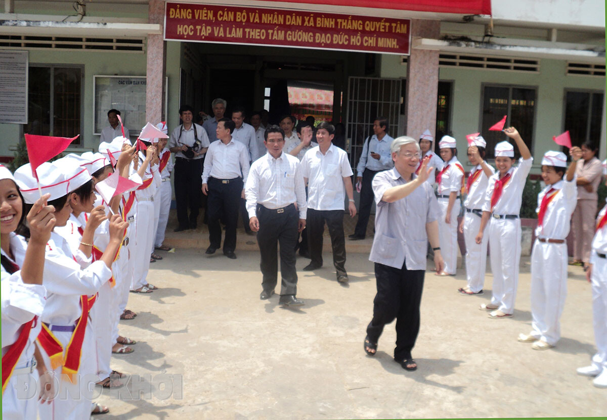 Lãnh đạo huyện Bình Đại và các em thiếu nhi chào đón Tổng Bí thư Nguyễn Phú Trọng. Ảnh: Lư Nhường
