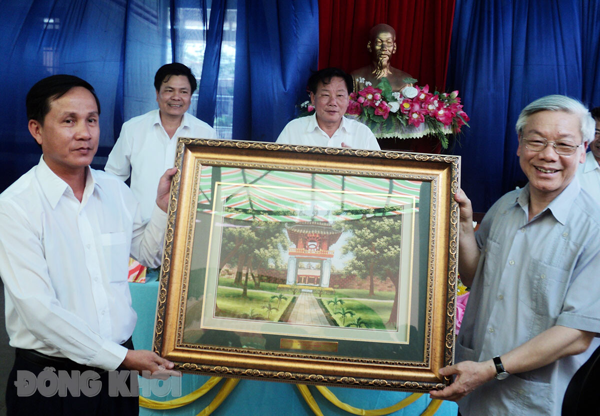 Tổng Bí thư Nguyễn Phú Trọng trao tặng bức tranh lưu niệm cho Đảng ủy, UBND xã Bình Thắng. Ảnh: Lư Nhường