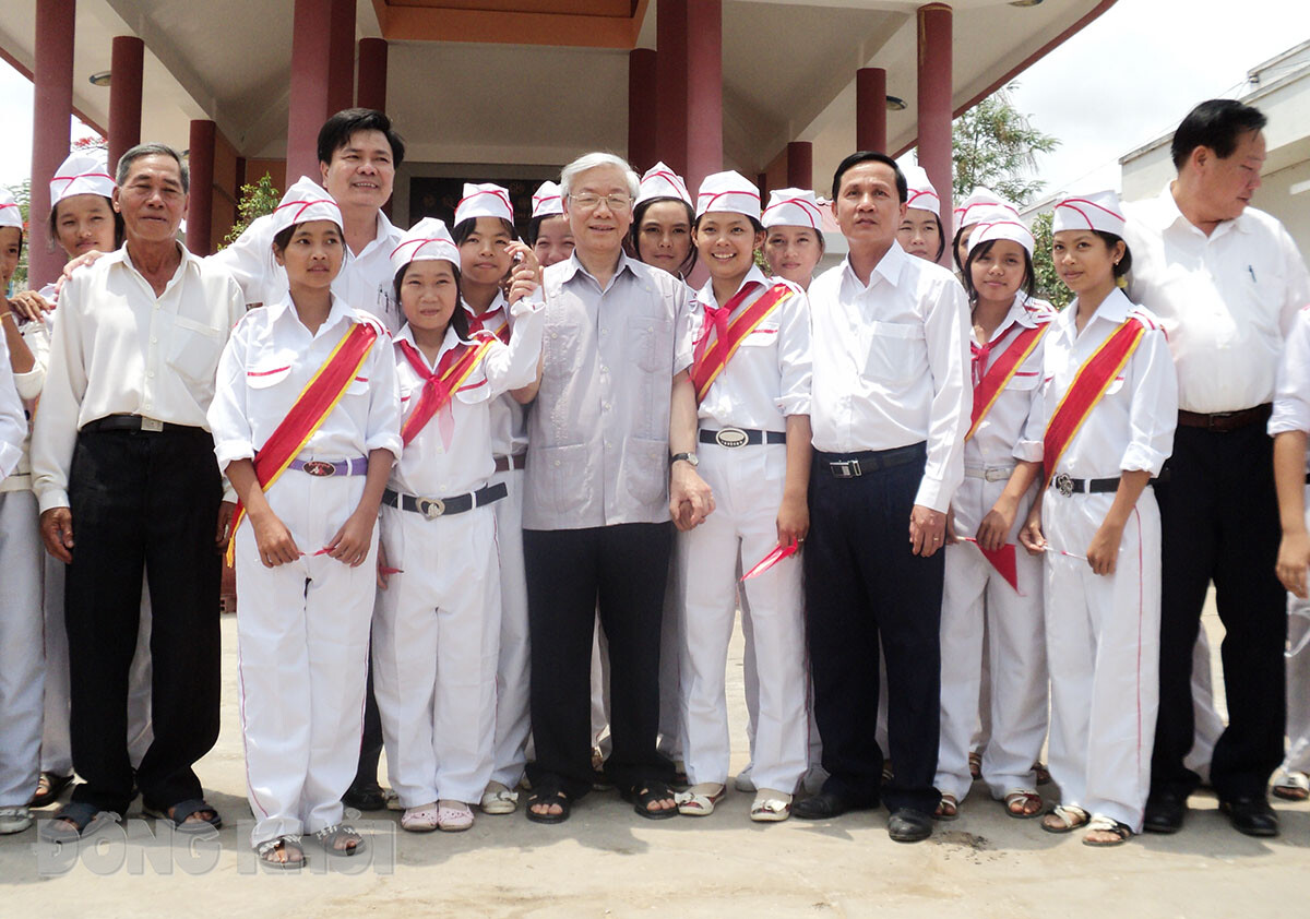 Tổng Bí thư Nguyễn Phú Trọng chụp ảnh lưu niệm cùng lãnh đạo huyện Bình Đại và các em thiếu nhi. Ảnh: Lư Nhường