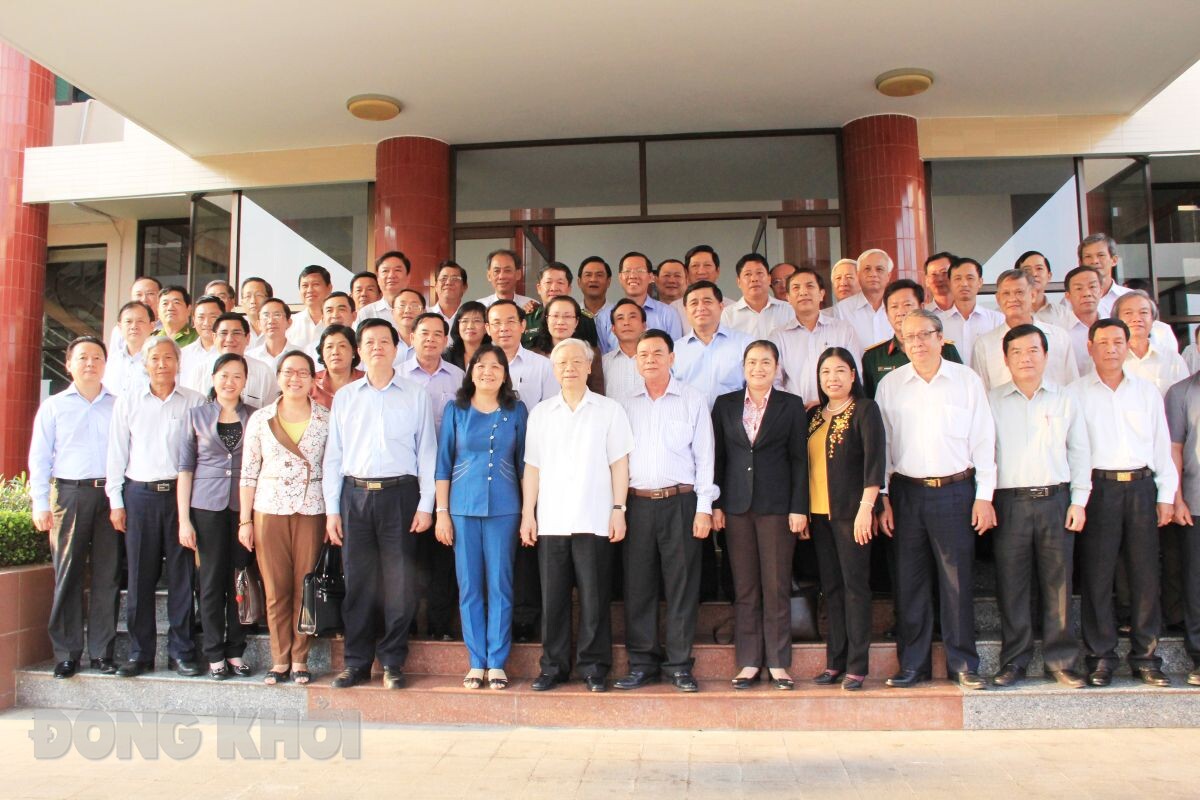 Tổng Bí thư Nguyễn Phú Trọng chụp ảnh cùng lãnh đạo tỉnh Bến Tre. Ảnh: M. Phương