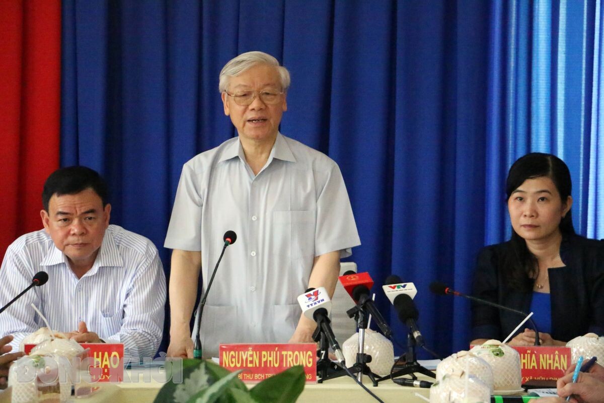 Tổng Bí thư ân cần động viên bà con đoàn kết, tương trợ lẫn nhau, vượt qua giai đoạn khó khăn do ảnh hưởng từ thiên tai, biến đổi khí hậu đang ngày càng rõ nét, nghiêm trọng ở đồng bằng sông Cửu Long, đặc biệt là Bến Tre, trong đó có huyện Giồng Trôm và nhiều huyện, xã, thị trấn trên địa bàn tỉnh. Tổng Bí thư Nguyễn Phú Trọng khẳng định Trung ương luôn sát cánh cùng tỉnh, huyện và xã trong ứng phó với biến đổi khí hậu, tìm các giải pháp đồng bộ, hạn chế thấp nhất những thiệt hại cho sản xuất và đời sống sinh hoạt của bà con. Tổng Bí thư đề nghị lãnh đạo Bến Tre, huyện Giồng Trôm tiếp tục quan tâm chỉ đạo sâu sát, triển khai các giải pháp phòng, chống hạn, mặn, giúp bà con nhân dân ổn định đời sống, sinh hoạt và sản xuất. Về lâu dài, Bến Tre cần có quy hoạch tổng thể, cập nhật kịch bản biến đổi khí hậu, từ đó có giải pháp thích hợp để ứng phó với hạn hán, xâm nhập mặn.