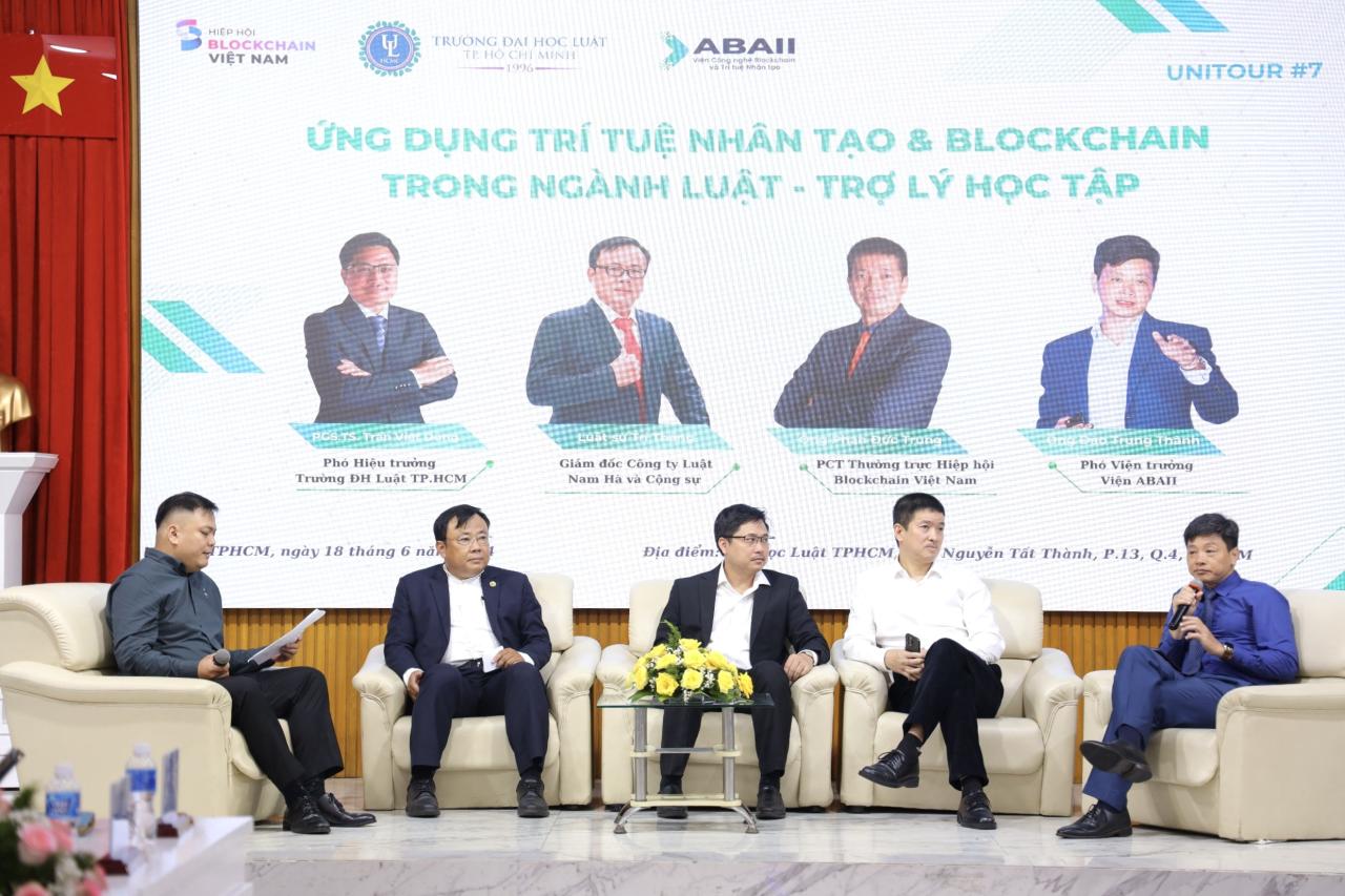 Theo đó, Hiệp hội Blockchain Việt Nam (VBA), Viện Công nghệ Blockchain và Trí tuệ nhân tạo ABAII đã phối hợp với Đại học Luật TP.HCM tổ chức tọa đàm “Ứng dụng AI & Blockchain trong ngành luật” cho giảng viên, sinh viên nhà trường và ký kết Biên bản Ghi nhớ (MOU) về việc thúc đẩy đào tạo, phổ cập blockchain, AI.