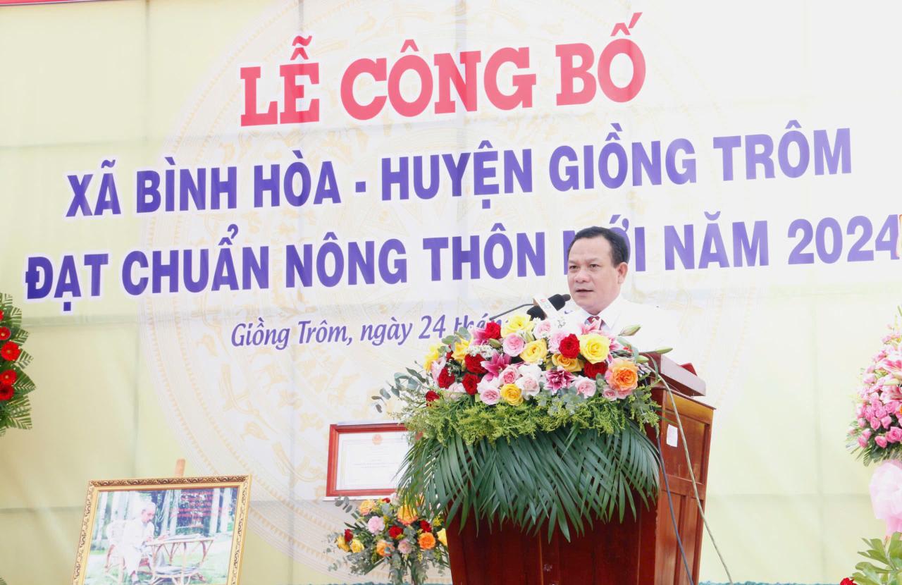 Phát biểu tại buổi lễ, Chủ tịch UBND huyện Giồng Trôm Lê Văn Tường trân trọng ghi nhận, đánh giá và chúc mừng, biểu dương thành tích trong xây dựng nông thôn mới (NTM) mà Đảng bộ, chính quyền và nhân dân xã Bình Hòa đã nỗ lực phấn đấu đạt được trong những năm qua.