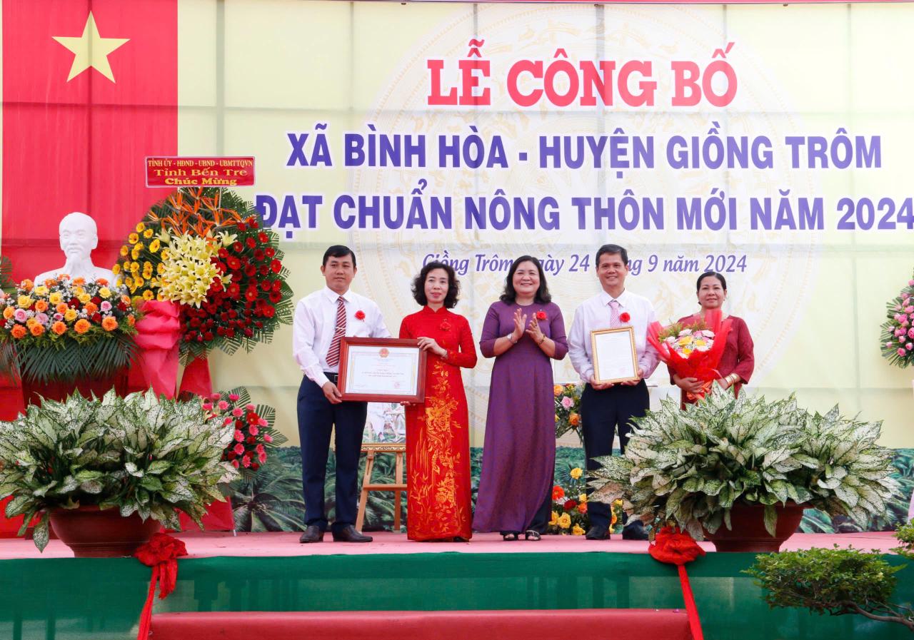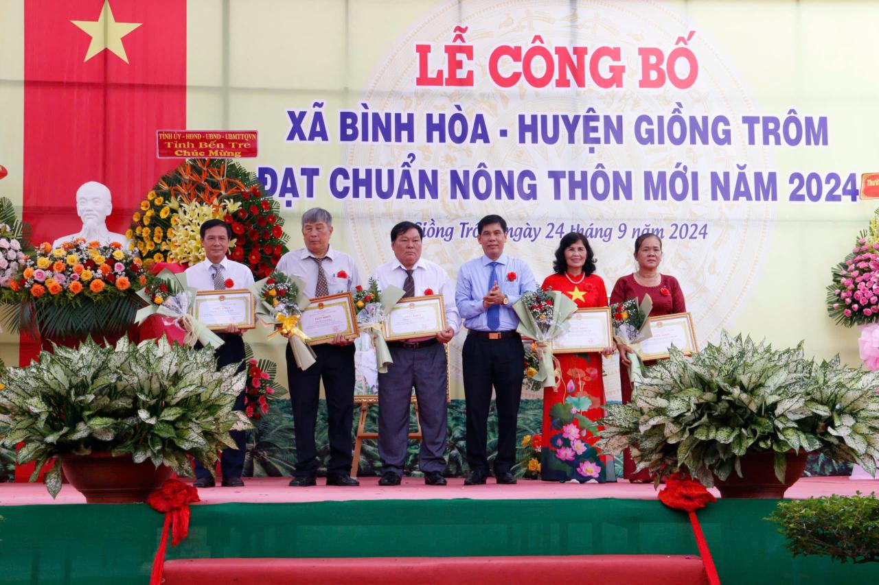 Ngày 24/9/2024, UBND huyện Giồng Trôm tổ chức lễ công bố xã Bình Hòa đạt chuẩn xã NTM. Đến dự lễ có nguyên Bí thư Tỉnh ủy Võ Thành Hạo; Quyền Bí thư Tỉnh ủy – Chủ tịch HĐND tỉnh Hồ Thị Hoàng Yến; Giám đốc Sở Nông nghiệp và Phát triển nông thôn Đoàn Văn Đảnh; Phó trưởng ban Thường trực Ban Tuyên giáo Tỉnh ủy Nguyễn Trúc Hạnh, cùng lãnh đạo các sở, ban, ngành đoàn thể tỉnh, huyện và đông đảo nhân dân trong xã.